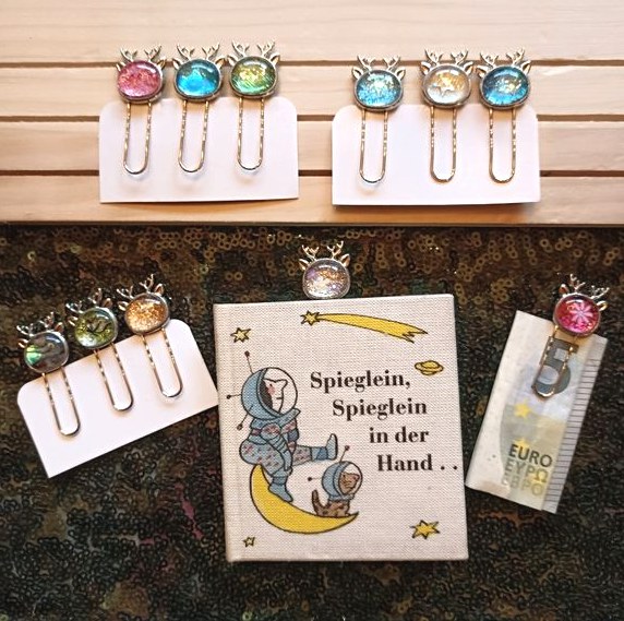 Ob flippige Weihnachtsohrringe, Tischdeko mit Zimstangen, oder drahtige Teelichthalter... ich bin total am Ackern. Für die Weihnachtsmärkte im Dezember muss ich noch jede Menge gestalten. Stress pur, aber es macht Freude. Die kleinen bunten Elch-Klammern sind ideal als Lesezeichen oder als kleines "Anhängsel" für ein Geldgeschenk. |